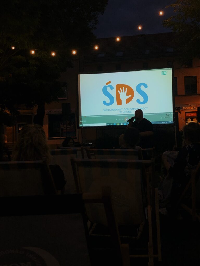 Ale w niewielkiej Mosinie się to udaje… I to chyba największe zaskoczenie podczas naszej wyprawy. Bo sam seans „pod chmurką” był niezwykle udany. Był piękny słoneczny dzień i wieczór (ponoć od dawna nie dawało się w okolicy zrobić pokazu, ale dopiero w Mosinie dopisała pogoda), a lokalizacja była fantastyczna: lokalny rynek w tzw. Strefie Relaksu, czyli trawniku wśród drzew, który oświetlono urokliwymi światełkami. Do tego niezwykle serdeczni organizatorzy z gminnego Środowiskowego Domu Samopomocy oraz panie z Koła Gospodyń Wiejskich „Piękni i Młodzi” w Pecnej, które serwowały własnej roboty, absolutnie przepyszne przekąski. Idealnie? Oj, tak! Tak chce się żyć.